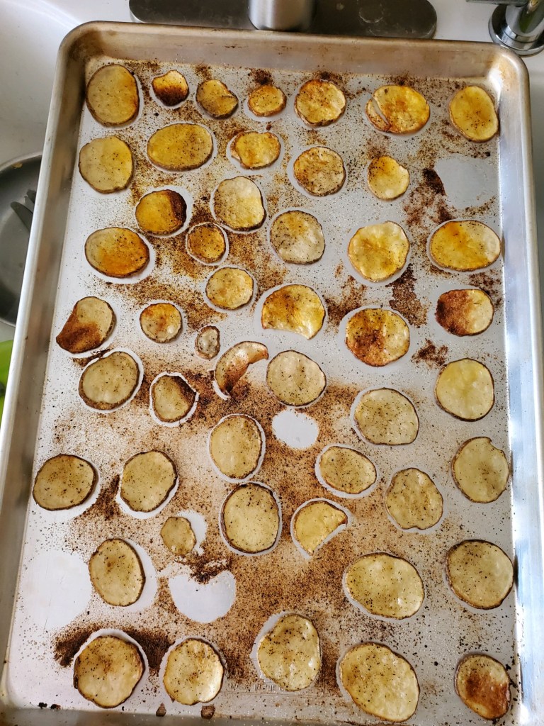 We made potato chips and they were good. I put popcorn seasoning on them. I used the ranch and cheddar flavor’s and salt and pepper. And I didn’t have to cut them with a knife because my mom had a potato slicing tool.