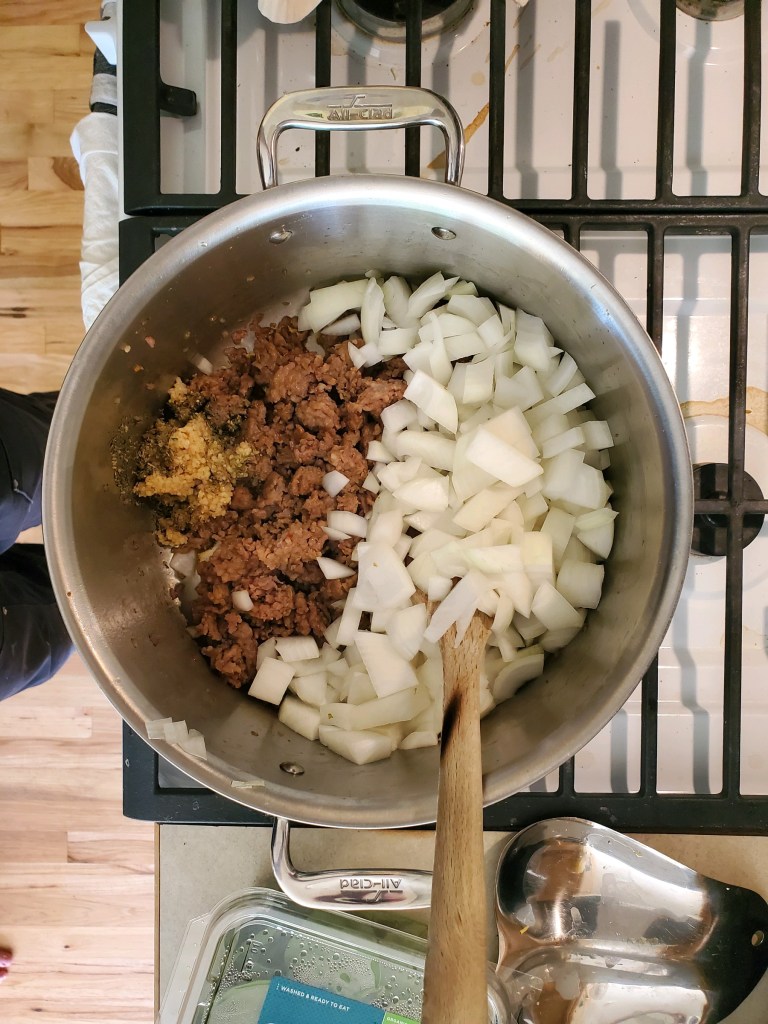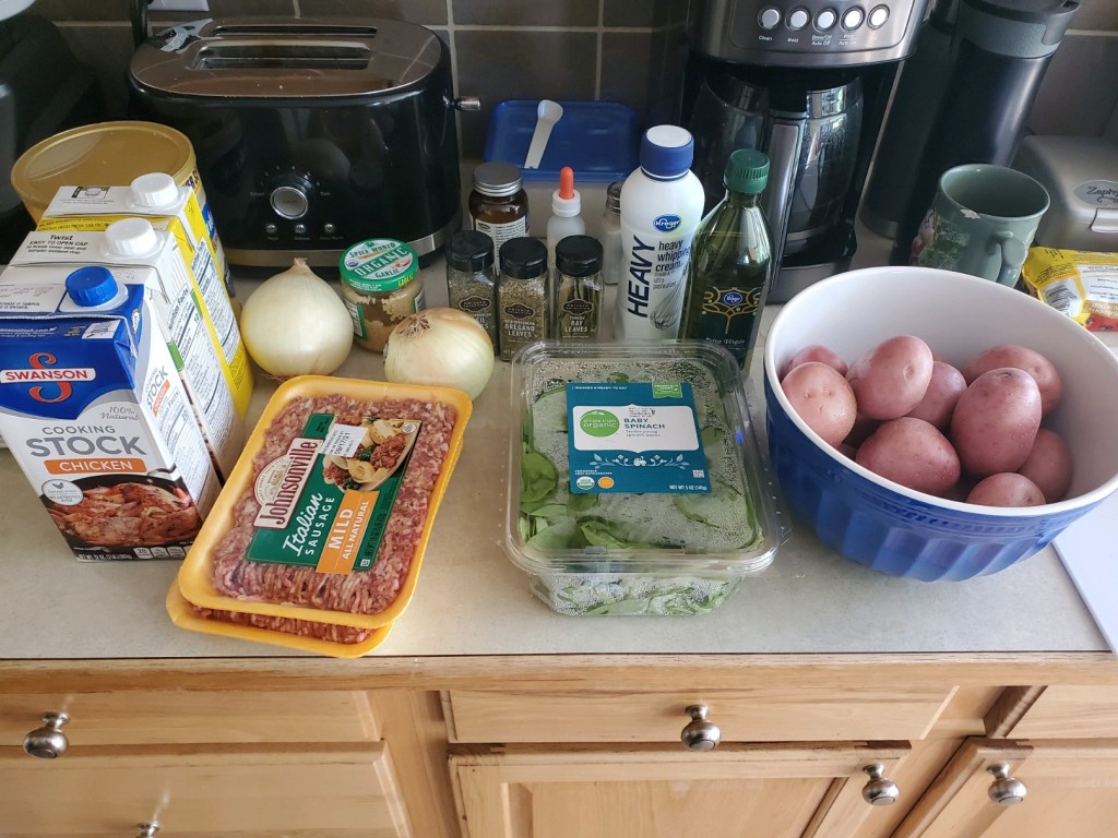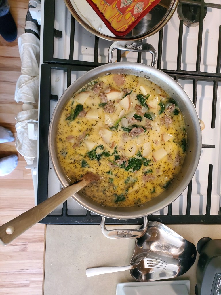 Because I thought the orange and onion salad would be gross, I made spinach and sausage soup. We’ve made it like three times before I started this class.