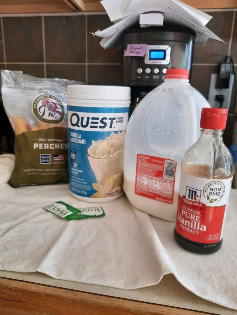 I made the peach cobbler smoothie. I only made one for myself because my brothers didn’t want one. I made it a little differently than the recipe said. I made it with vanilla extract, vanilla protean powder, and stevia. It tasted like orange sherbet ice cream.