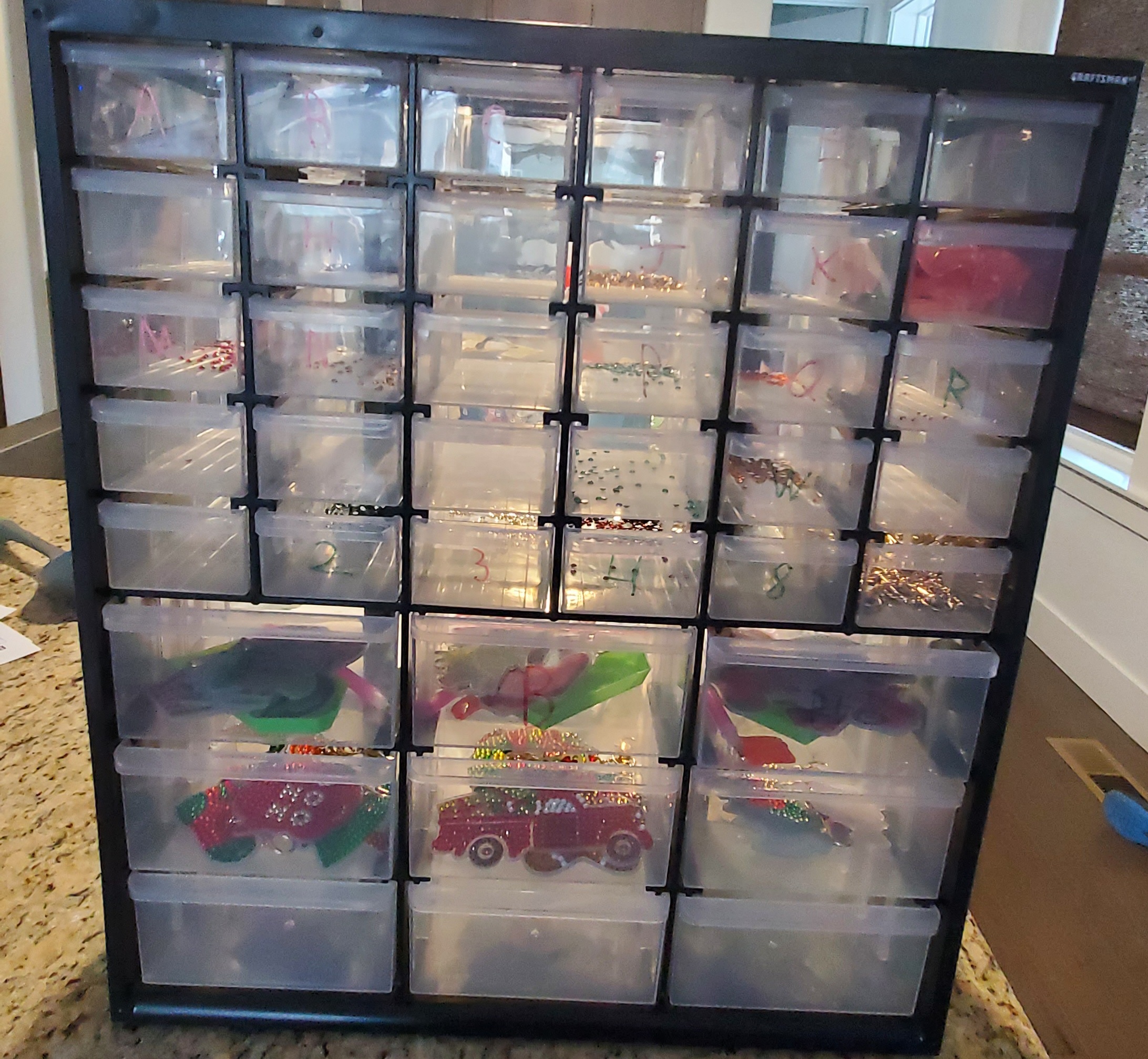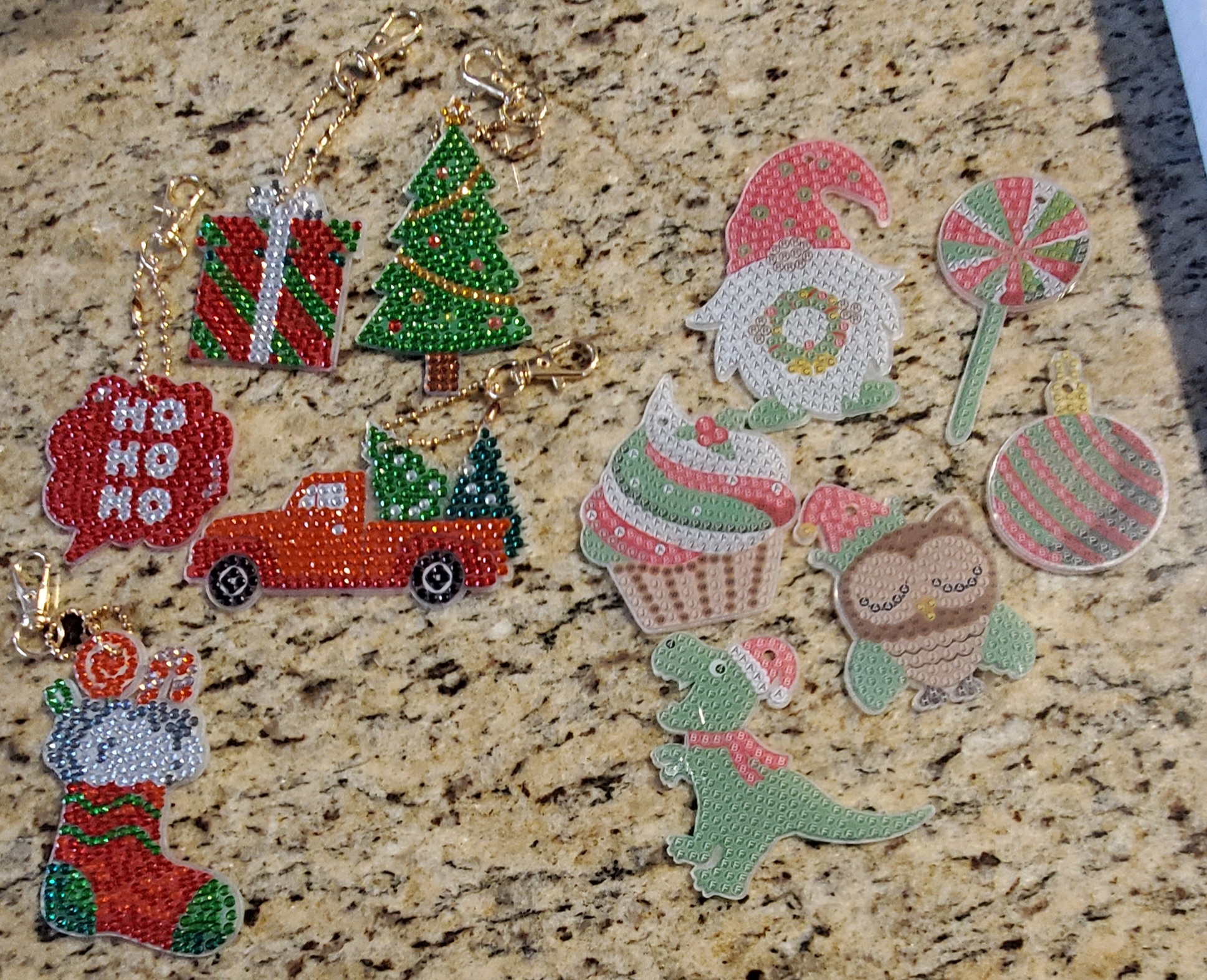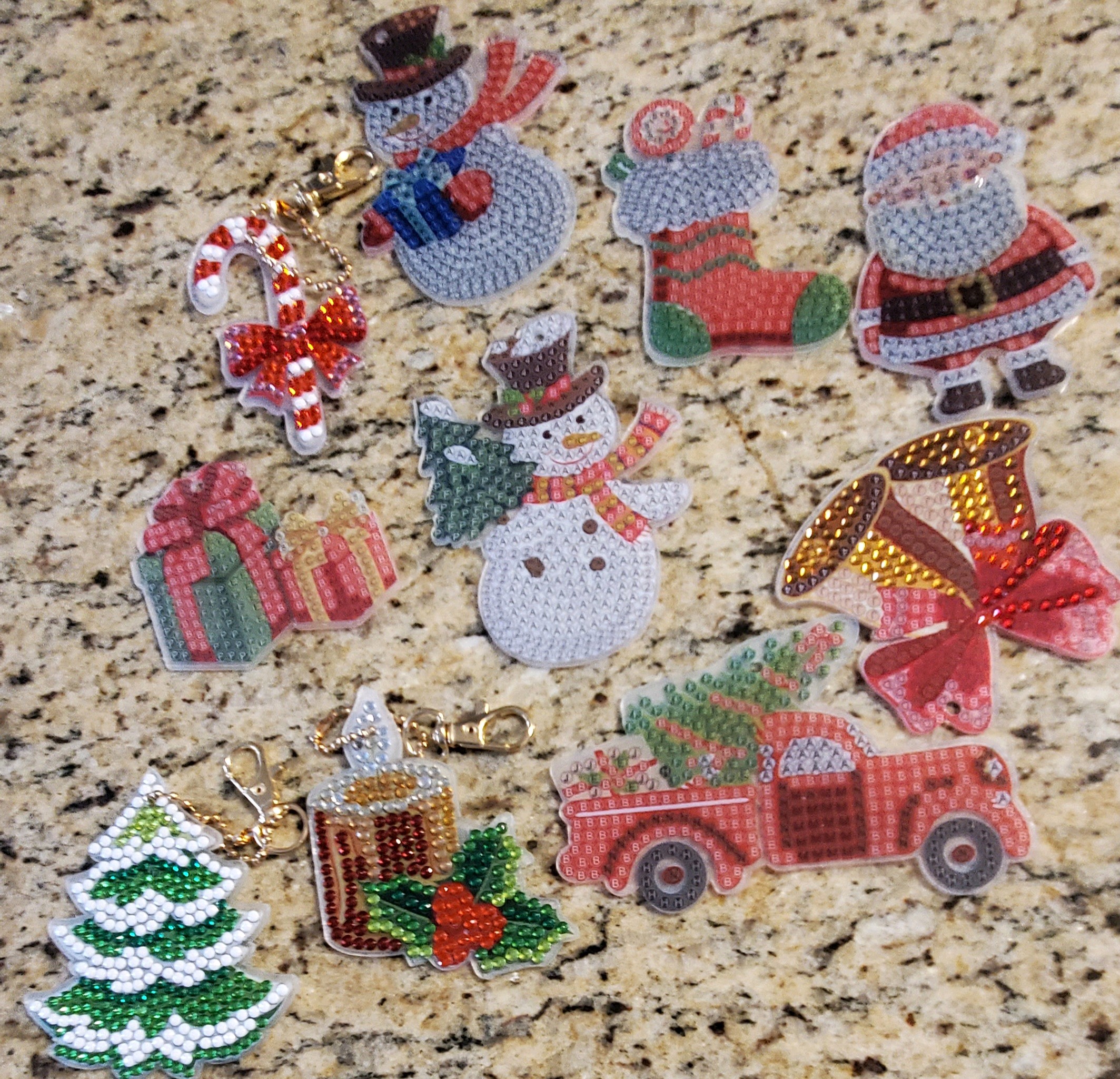 We got Some DIY gem ornaments a few days ago. The ornaments are like color-by-number and have a film on them and when you take them off its sticky so the gems stay on. To put the gems on you get a little bit of the red gel in the tip of the pen so the gems stick until you put it on the ornament.